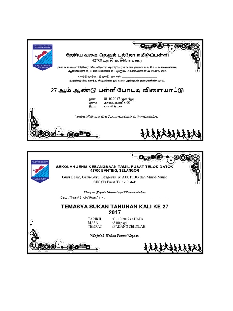 Koleksi Pantun Pengacara Majlis 2022. Kad Jemputan Sukan Sekolah Tamil Negeri Pera. Contoh Kad Jemputan Hari Kantin.